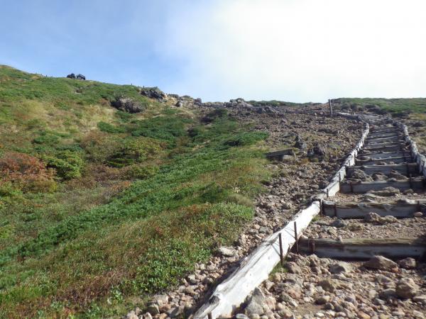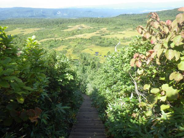 上毛無岱から下毛無岱への木の階段は、思わずちびってしまいそうな程の急勾配!絶対に登りには使いたくない程の傾斜だ
