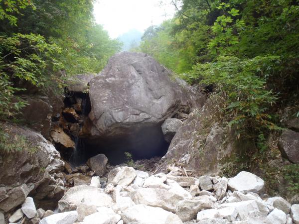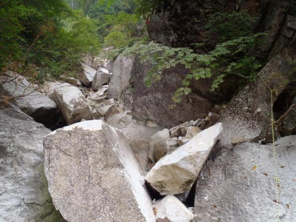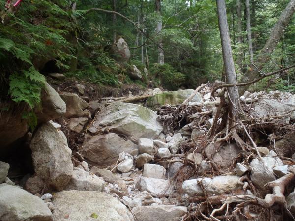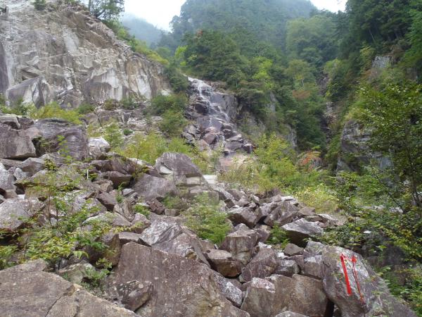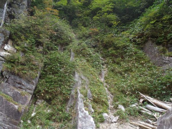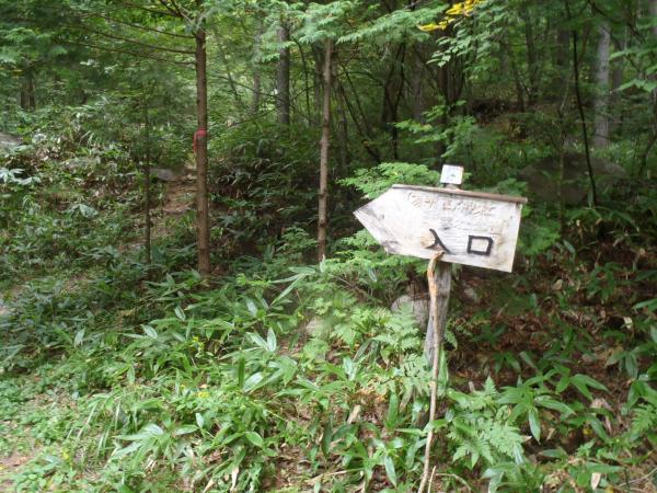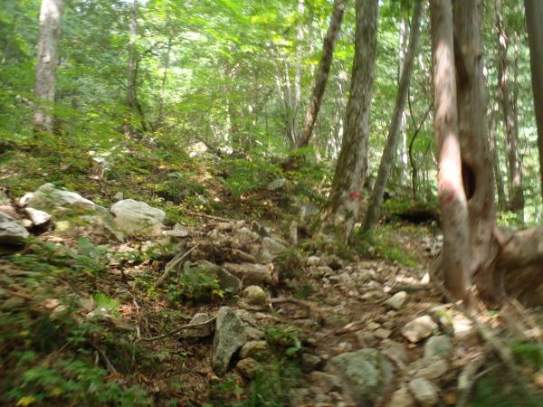 はじめは、樹林帯と沢沿いを歩きます、あんまり人が入っていないようでクモの巣が歩くたび顔に引っかかりました。