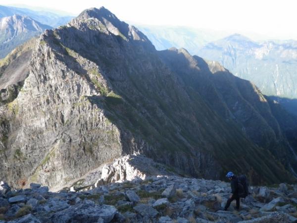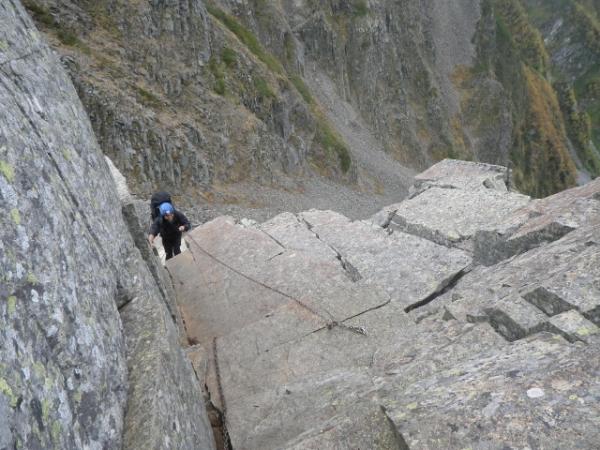 奥穂~西穂のいくつかある難所の中で一番難しく感じたのは馬の背でした。奥穂側からの縦走だと一番初めに出てくる上に、下りとなるのでそう感じたのかもしれません。ただ、普段GR三重でクライミングをしているのでその経験がフルに生かせたと思います。逆に言えば、基礎的なクライミング技術を身に着けてから登られるとすごく楽しめると思いますよ。