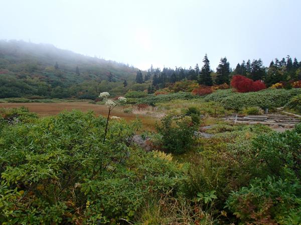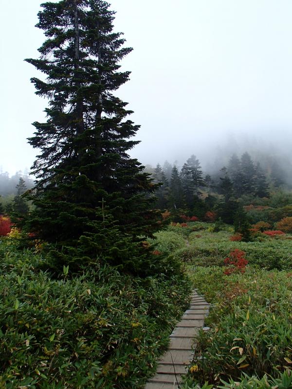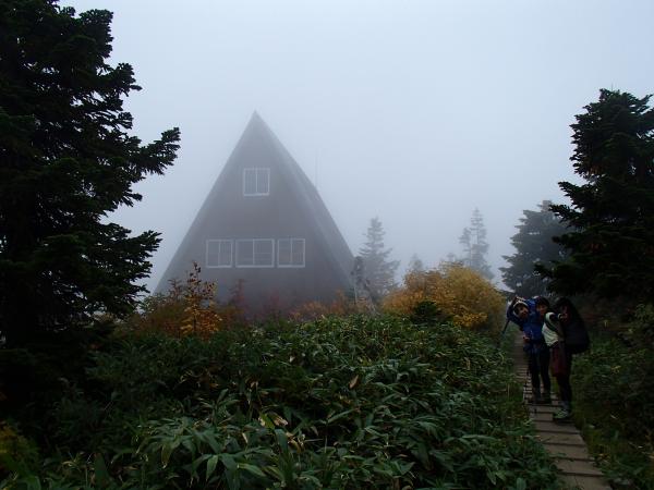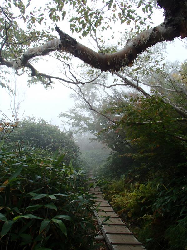 夜から朝にかけては雨が降り注ぎ、朝起きてからも霧雨のような雨がずーっと降っていてあたりは真っ白・・・。少し悩んだ結果、火打山に登ることはやめゆっくり下山することにしました。