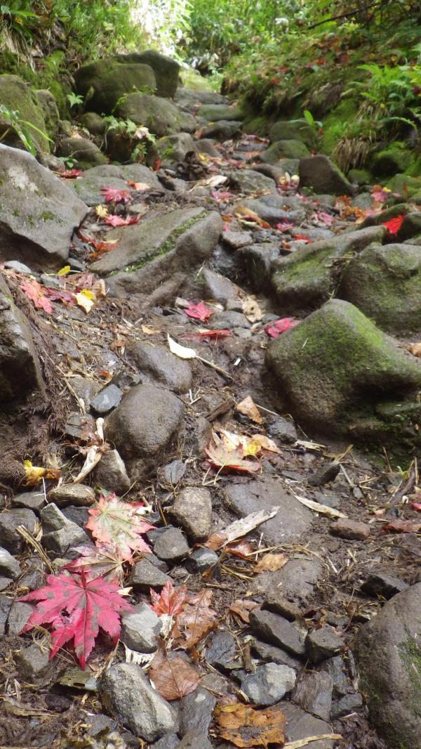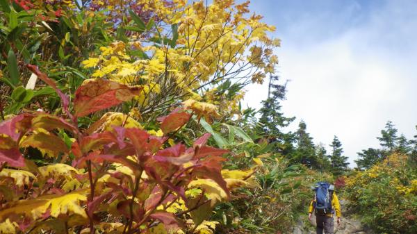 沢を渡り、十二曲りというその名の通り十二回曲がる登山道なのですが、そのあたりは傾斜があり頑張りどころです。ところどころに色づいた葉っぱを見ながら、紅葉にはまだ早いかなぁ~という感じ。空には青空もみえていました。富士見平という分岐点を通過したあたりからポツポツと、冷たい雨が降ってきました。氷のように冷たい雨に気持ちが沈みながらもあと少しで着くはずの小屋へと黙々と歩を進めました。