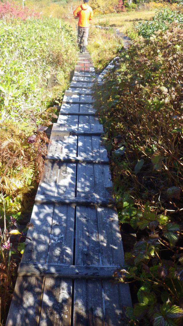 下山の時には太陽で、凍った木道は溶けて乾いており、朝とは打って変わって気温もあがり暑いくらいでした。全体を通して木道が多く歩きやすかったことと、思ったより紅葉が進んでいたので良かったです。