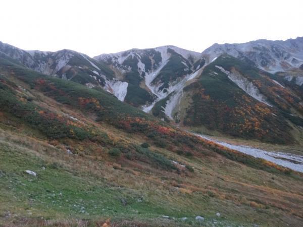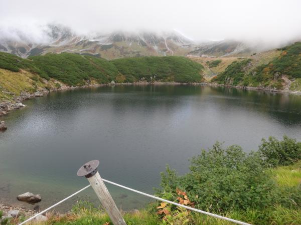 室堂はガスの中。思っていたより暖かでしたが、紅葉は始まっているようです。ガスに覆われたみくりが池を越えると徐々に視界が開けてきました。血の池はまさに言葉通り。草紅葉が湖面に反映し血のように赤く見えます。地獄谷では強烈な硫黄の匂いが鼻をついてきます。様々な見どころを堪能していると、漸く眼下に本日の宿泊地・雷鳥沢が見えてきました。