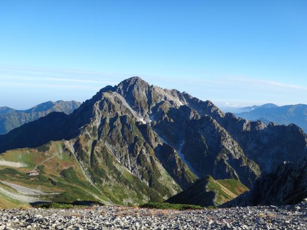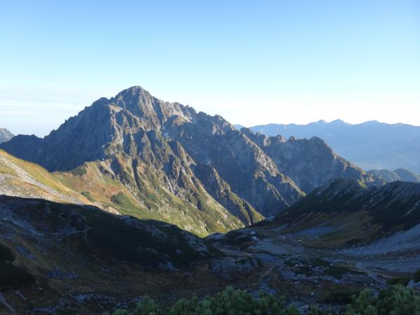 翌日は快晴。久しぶりの晴女です。ご来光は間に合わなかったけどアーベントグリューゲンに燃える薔薇色の山々に大感動!剱御前まで辿り着き、そして…憧れの剱がこんなに近くに!威風堂々という言葉がとても相応しかったです。左に後立山連峰、右に室堂平を仰ぎながら稜線歩きを楽しみます。真砂岳を過ぎると次第にごつごつした岩の道になります。修験の山らしくなってきました。