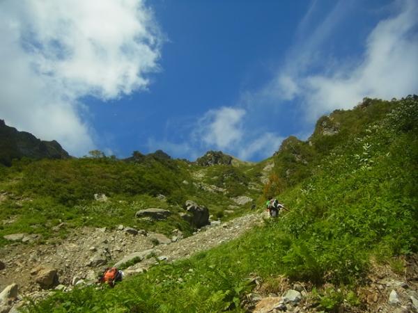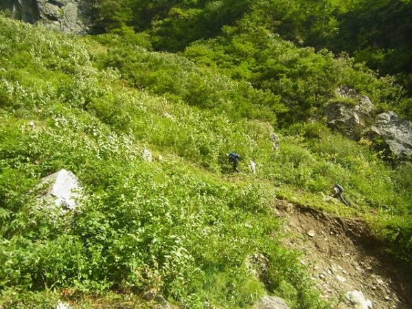 草付きを崩落地に沿って30mくらい高巻き枝沢まで行き