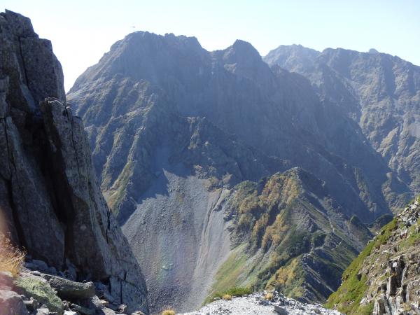 奥穂~吊り尾根~前穂~重太郎新道もこれまでの道のような切れ落ちた高度感は少ないですが、気を緩めることなく下ります。