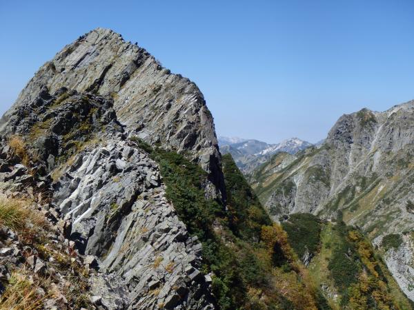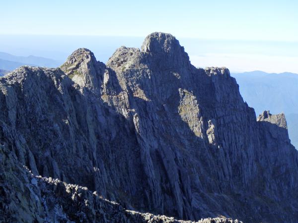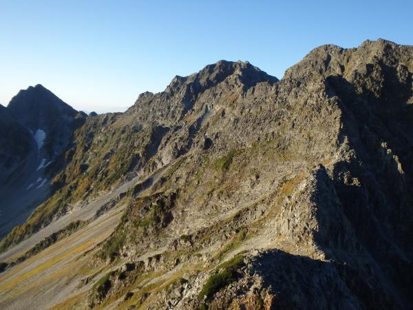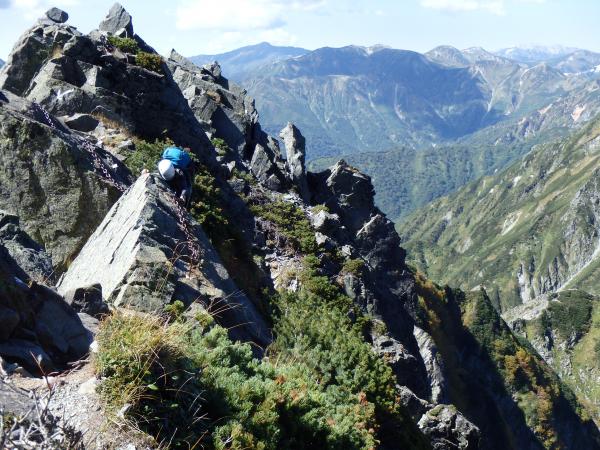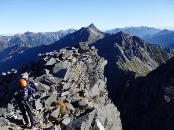 翌朝、涸沢カールを下に見ながら涸沢岳に。この区間も大キレットに負けず劣らずの岩稜帯。気を抜かずに慎重に。