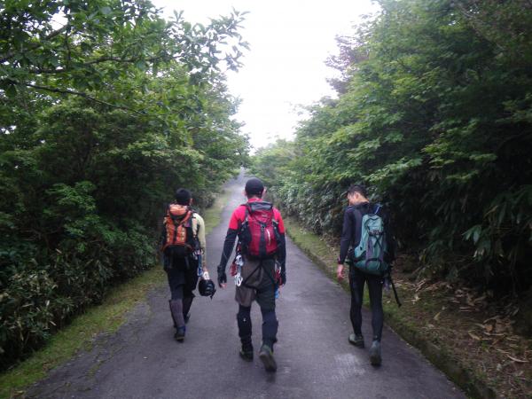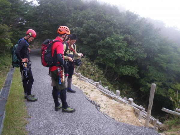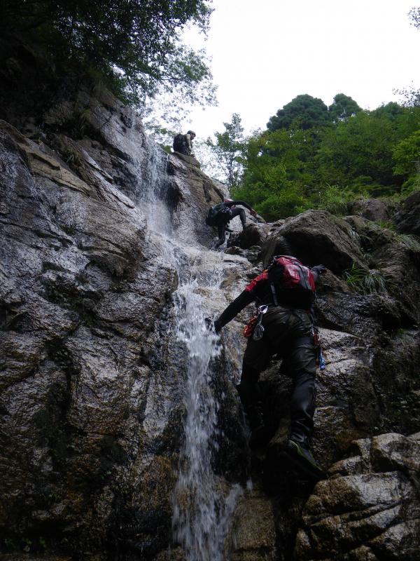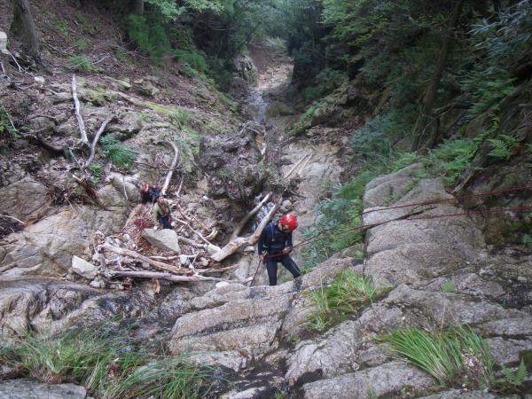 山上公園の周遊路から下降を開始しました。すぐに谷地形となり、クライムダウンが続きます。途中2箇所ほど懸垂下降しました。立木が少ないのでハーケンを持っていくと良いと思います。下部の西多古地大滝は左岸から大きく巻き、そのまま表登山道に合流し、下山となりました。