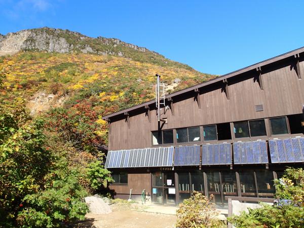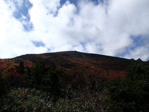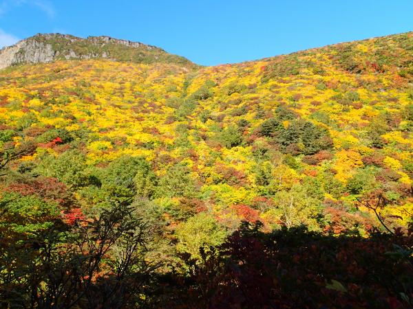 ほどなく、くろがね小屋に着くかという所で紅葉全開の鉄山の山肌が見えてきた♪