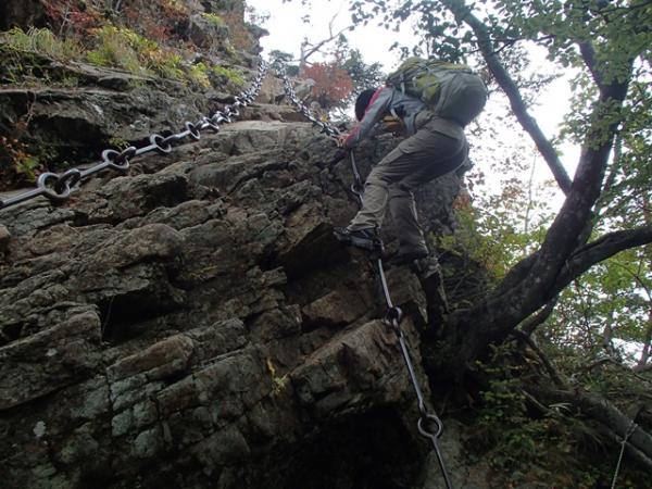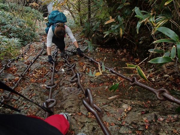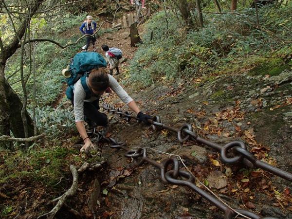 ルート後半の鎖場は、雨で鎖や岩が濡れていたのでスリップしないよう細心の注意を払いました。岩を登ったり高いところが苦手な方はまき道を通った方が無難です。