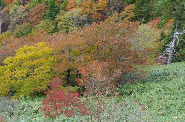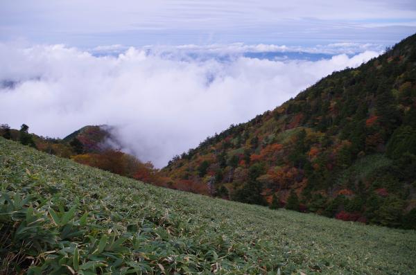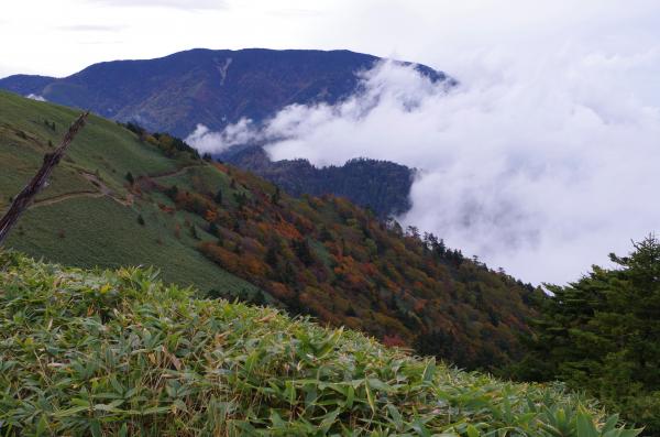 広い笹原の高原で、紅葉は1500m付近がとても良い状態です、車で神坂小屋までは入れますが、強清水から歩くか、ヘブン園原のゴンドラ利用をお勧めいたします