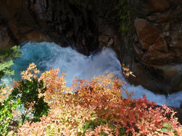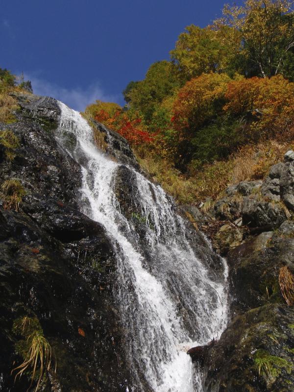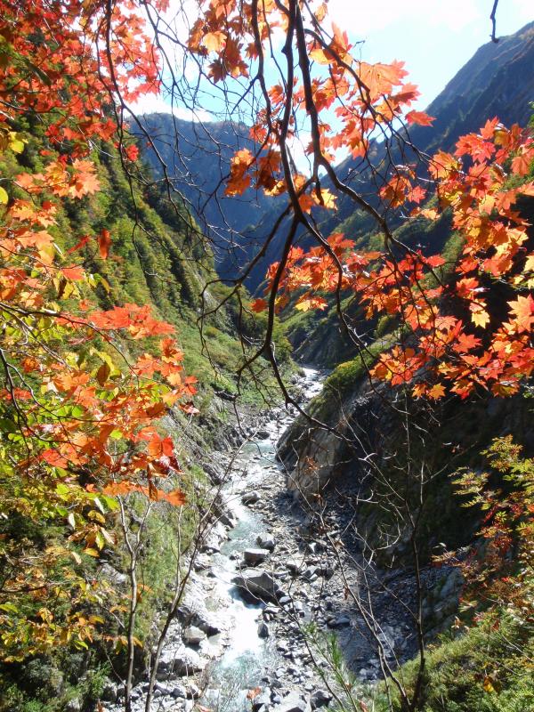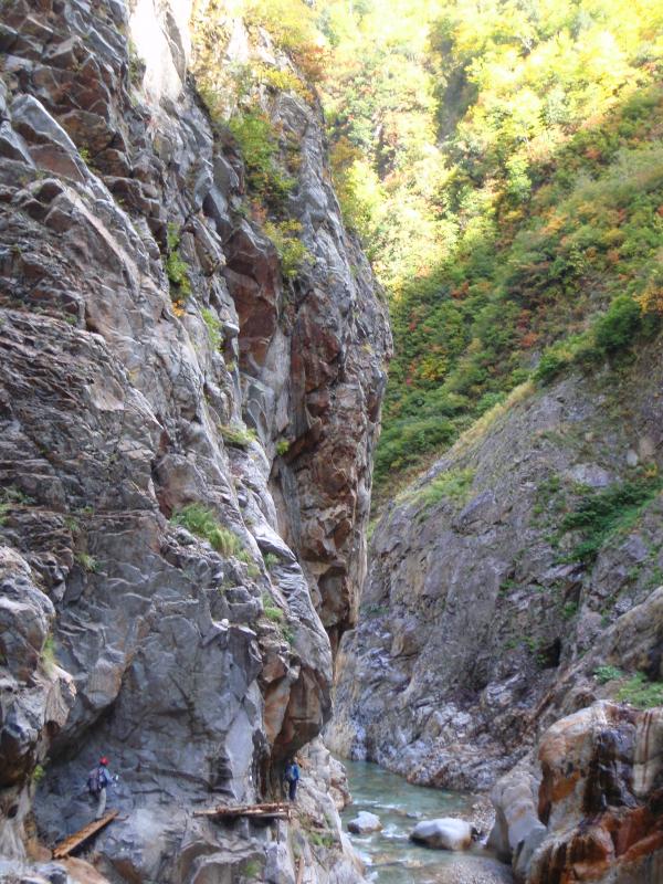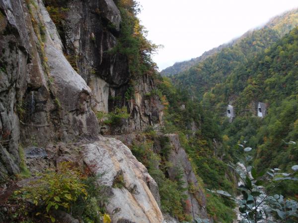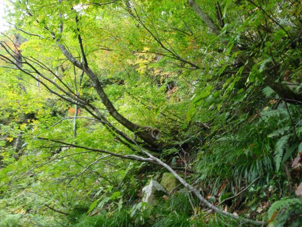 紅葉を楽しみながらも片手は、必ず針線か岩を掴んでいないとバランスを崩すような細い道です。