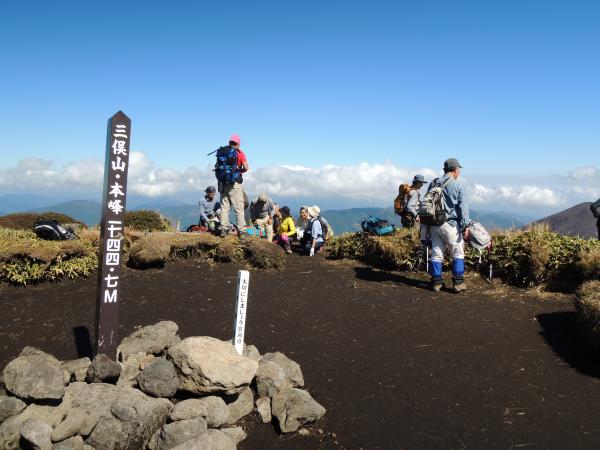 西峰から本峰へは笹の道が続き、本峰から急斜面を下りますが滑りやすく注意が必要です。