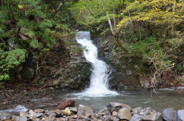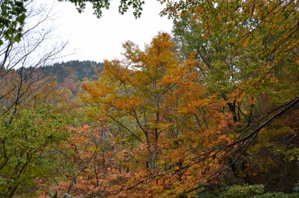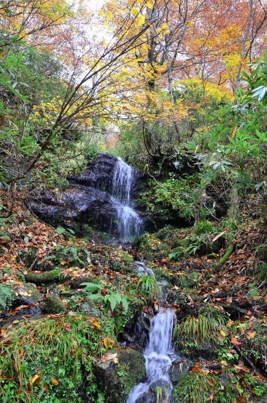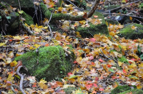 台風の影響か見上げる紅葉は少なく感じましたが、色とりどりの落ち葉、滝、緑が