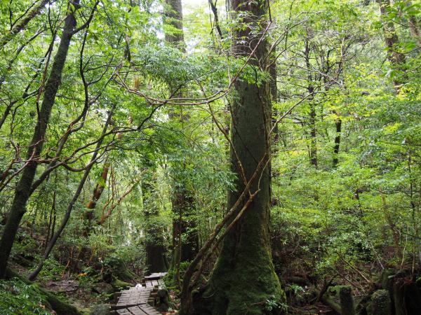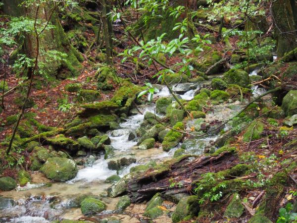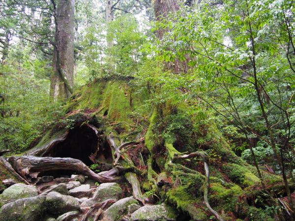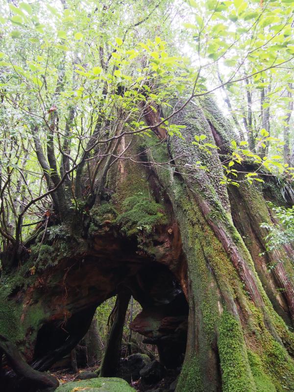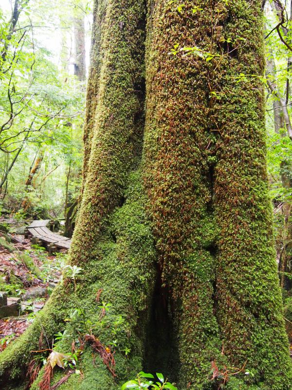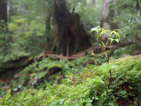 大株歩道に入ると少し傾斜があり、山道らしく大きな石や木の根っこでごつごつした箇所も出てくるようになる。小さな沢を渡ったり、橋があったりと、これまでの道よりは変化があり歩いていて楽しい。「大株歩道」と名の付く通り、本当に大きな切り株が多い。もし伐採されていなかったら..縄文杉のような巨大な屋久杉が生い茂る森になっていたに違いない。でも、切り株から伸びる新しい木々を見ていると、なんだか嬉しい気持ちになってくるから不思議だ。