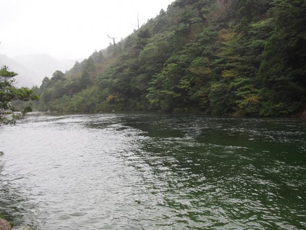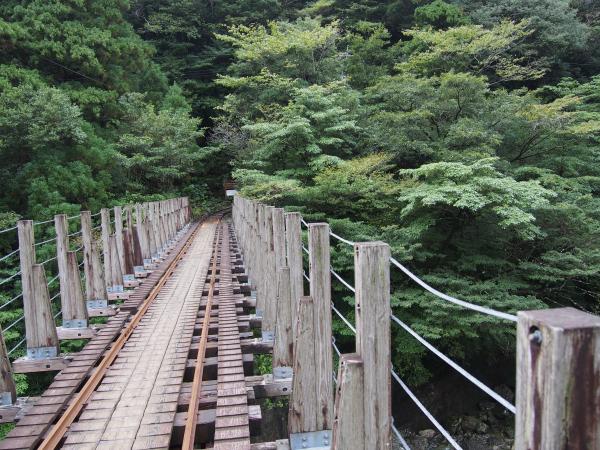 大きな吊り橋を渡り歩き進めていくうちに、徐々に明るくなっていき、小杉谷集落跡のあたりではすっかり日も昇っていた。相変わらず雨はやまない。