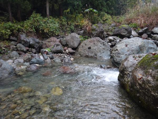 すると今度はゴロゴロした岩の枯沢に辿り着きました。アスレチックのように全身で攀じ登ります。体力は消費しますが変化に富みとても楽しめました。右岸に回り込むと漸く八ッ峰の奇峰が現れました。どんな道なんだろう?期待を膨らませながらとりあえず小屋を目指しました。