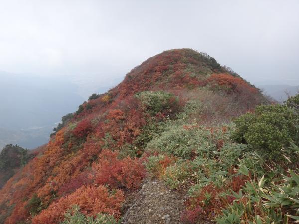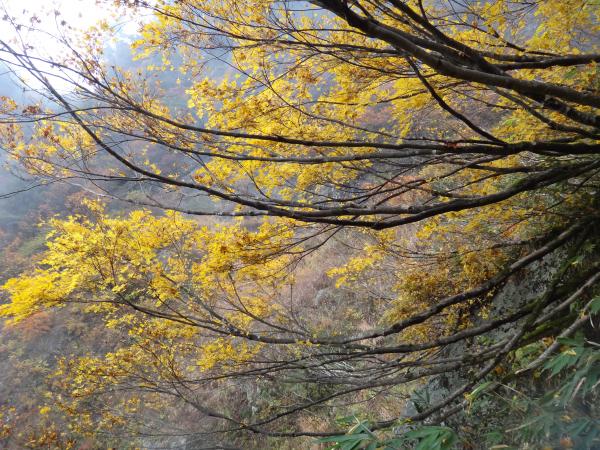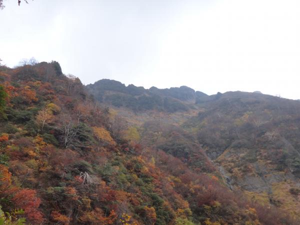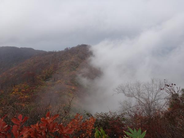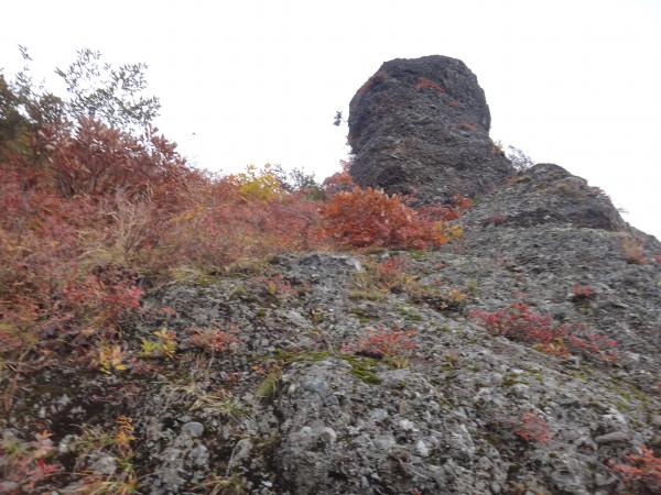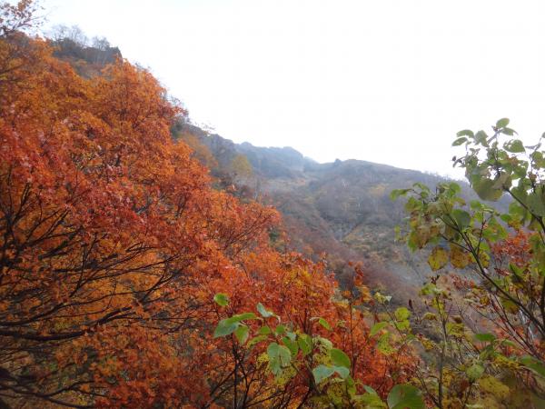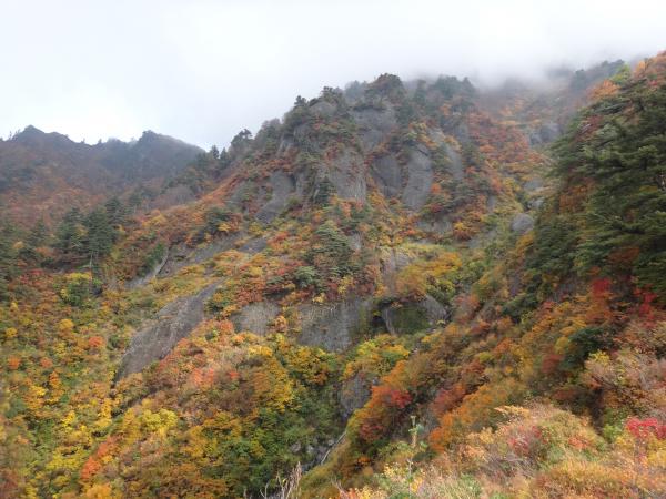 標高が高くなるにつれ、紅葉の鮮やかさも増していきます。特に七合目付近から左手に臨む岩山と赤黄のコントラストは見逃せません!まるで猊鼻渓のようで、苦労して登って来た甲斐があります。