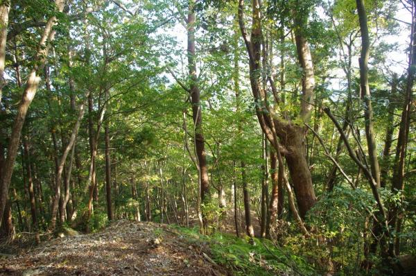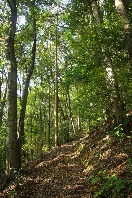 常葉樹の林の中のトレイルが続く。涼しいので夏にはこちらからの登ることをおすすめします。