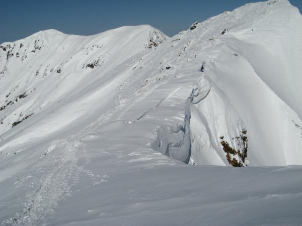 ところどころ雪庇の近くを歩く場所があるのでトレースから外れないようにし、怪しい場所には近づかないようにしましょう。