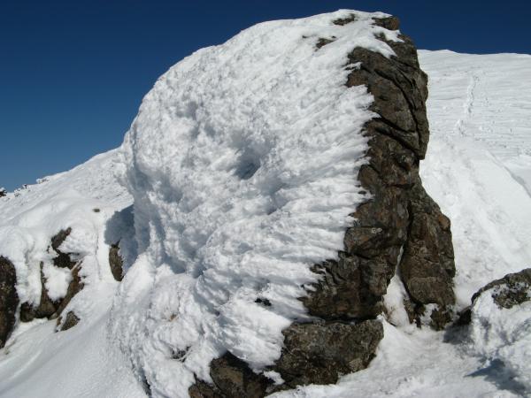 登りでは雪が深く軟らかかったので、思っていたよりも体力を使いました。トレースはあるのですが、スキーヤーやスノーボーダーはスノーシューで登るので、そのトレースをアイゼンで歩くと足が埋まることがしばしばあります。私が登った日は滑る人が9割、登山の人が1割って感じでした。