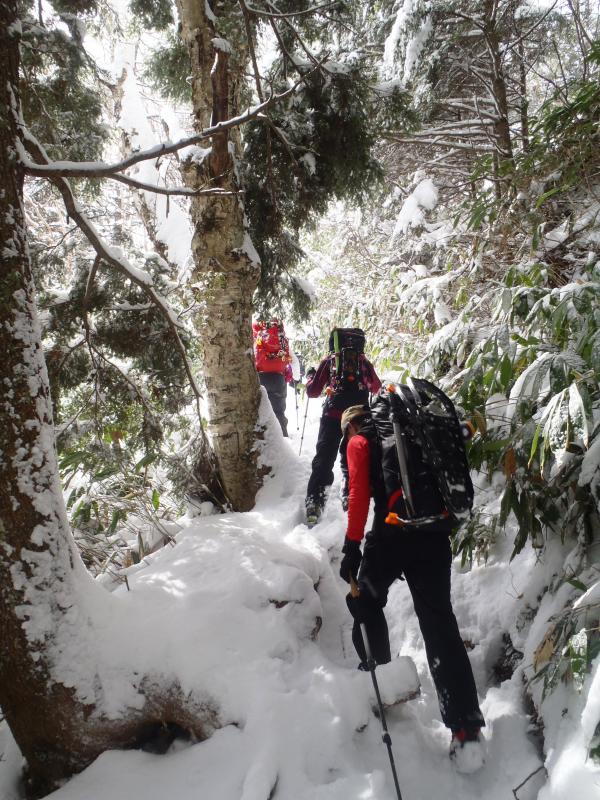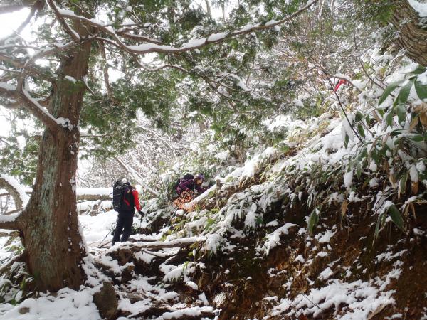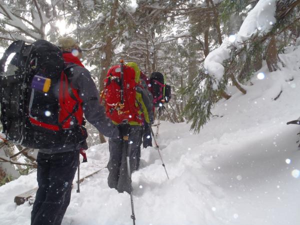 夜に降り続いた雪のため、小屋のかたが山頂までトレースを付けられないと戻ってきました。