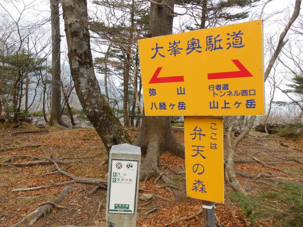- 行者還トンネル西口(55分)出合(20分)弁天の森(25分)聖宝ノ宿跡(45分)弥山山頂(25分)八経ヶ岳(25分)弥山(45分)聖宝ノ宿跡(40分)弁天の森(65分)行者還トンネル西口