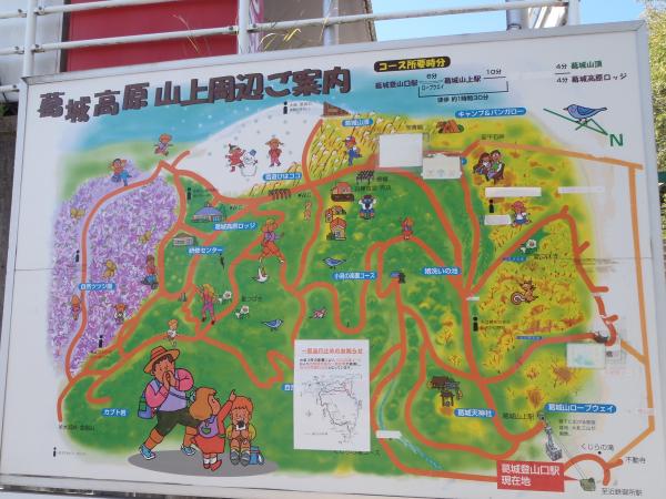 - ロープウエイ葛城登山口駅<60分>自然研究路分岐<10分>ダイトレコース分岐(北尾根コース)<60分>葛城山三角点<回遊路を40分>葛城天神社<2分>ロープウエイ葛城山上駅<ロープウエイで5分>葛城登山口駅