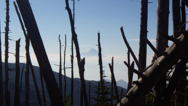 針葉樹の間から、薄ーく衣を纏った様な富士山が。久々に山から見る富士山です。