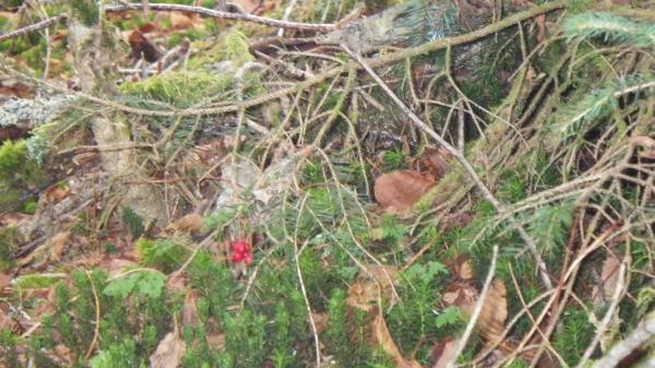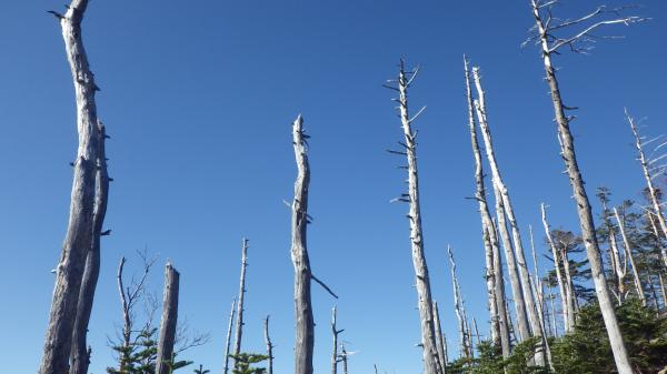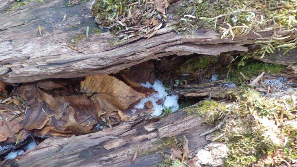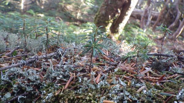 倒木に目を転じると、幹から新しい命がぴょこぴょこ芽を出していました。