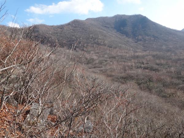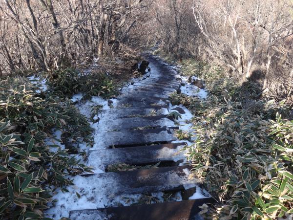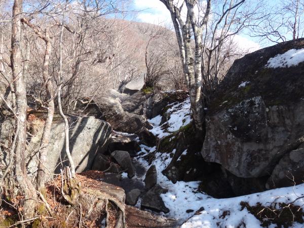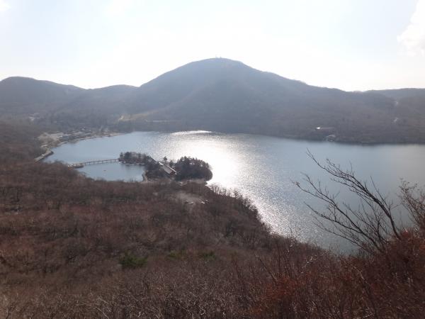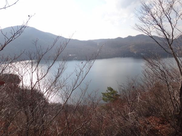 下山は少々手こずってしまいました。すれ違う登山者の方が口々に「下山は滑り易いから気を付けて!」と忠告してくれたにも拘らずやってしまいました(^^ゞアイゼンもあってもいいかもしれません。しかも岩の多い道なのでテンポ良く下ることができません。やれやれと思っているとこの日一番の絶景が!猫岩付近から眼下に広がる大沼(おの)が見渡せました。紺色の湖面はきらきらと輝き、赤城神社の赤が神聖な雰囲気を醸し出しています。紅葉の終わった冬枯れの縦走路もなかなか見事な眺めでした。