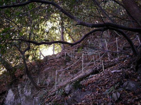 No.2の分岐を飯縄神社方面に向かいます。途中クサリ場と書かれていますが手すりがクサリになっているだけで、クサリを頼りに登る感じではありません。ただし斜度は急ですので滑りやすいです、慎重に登ります。