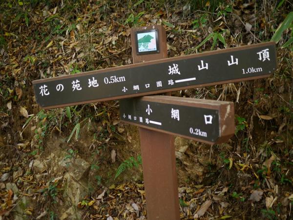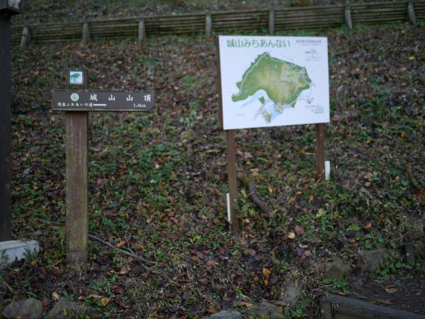 - 津久井湖観光センター駐車場(5分)登山口(30分)飯縄神社(10分)城山山頂(8分)女坂分岐(25分)津久井湖観光センター駐車場