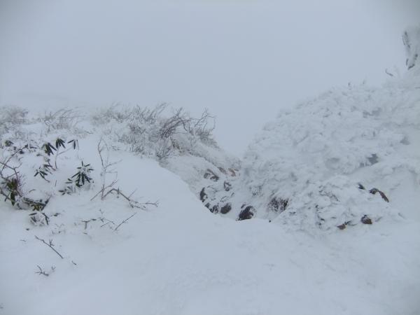 稜線を進むので眺めもよく気軽な積雪歩きを楽しんでいましたが、熊穴沢避難小屋をすぎてしばらくすると完全にホワイトアウトしてしまいました。