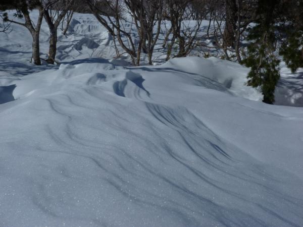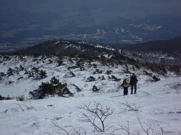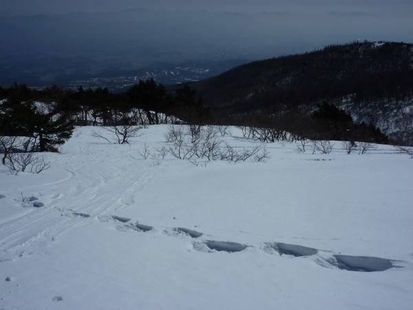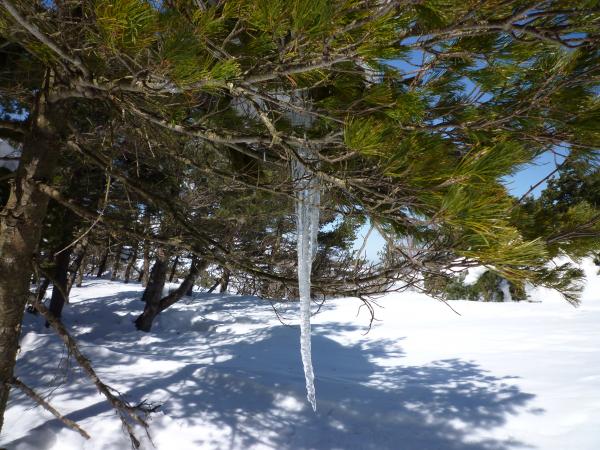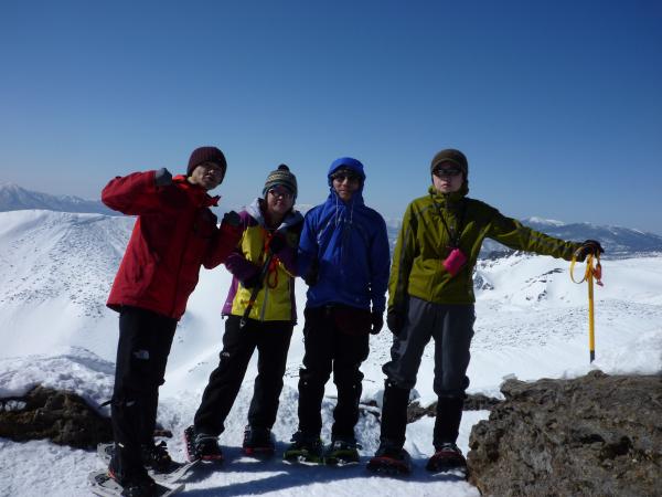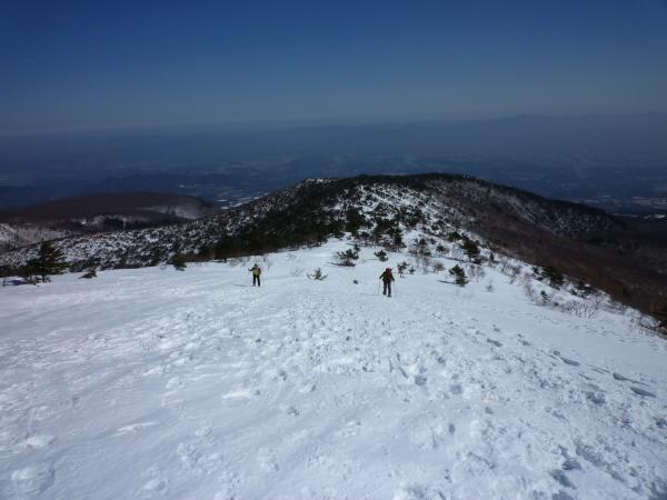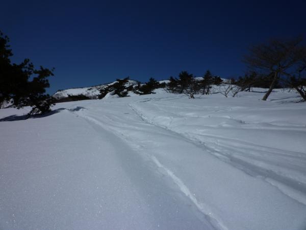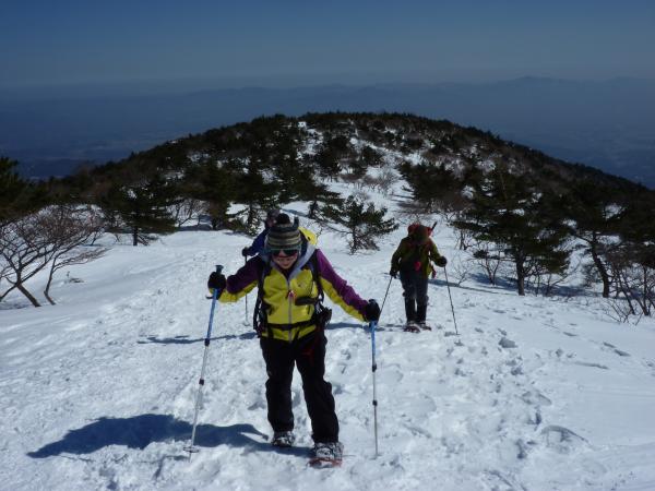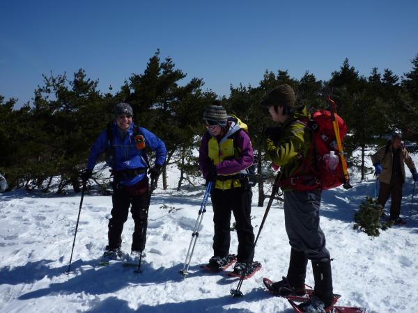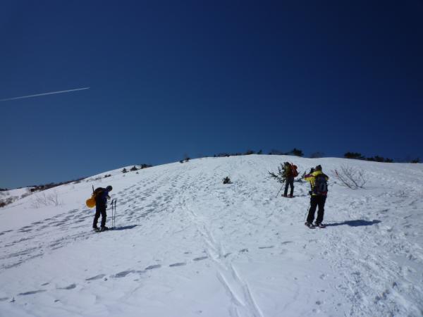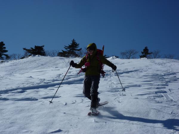 緩やかな斜面をひたすら直登です。前述の通り、この日はありえないくらいの快晴&高温だったので雪は溶け、スノーシューでなくてもつぼ足で登れたくらいですが、この時期は一般的にはスノーシューがよいでしょう。