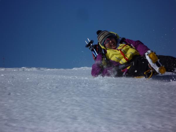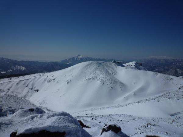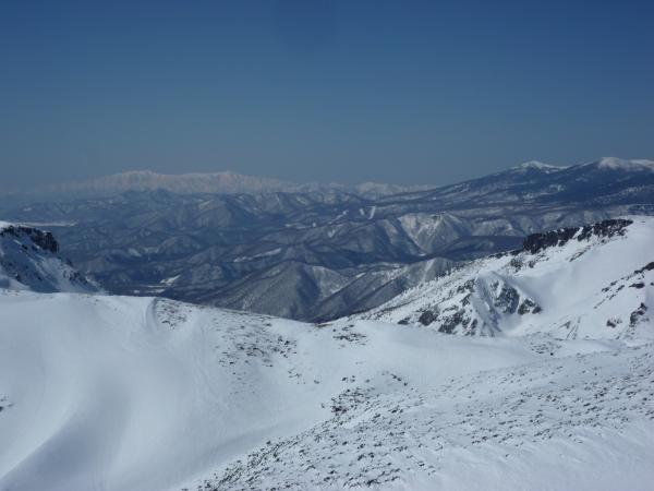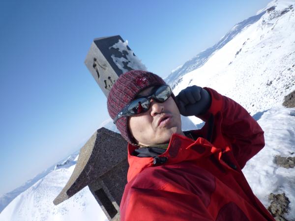 『冬の安達太良山』は強風で有名ですが、今回はこの山はそんな横顔すら見せませんでした。とにかく自然ににやけてしまうほど天気がよすぎて、冬山をなめてしまいそうです、ハイ。しかし、登り始めは腕まくりをしていた僕ですが、徐々に風は強くなり、山頂に着く頃にはジャケットのベンチレーターも閉めてしまいました。山頂からは磐梯山、吾妻山、飯豊連峰、そして蔵王、と東北を代表する百名山が次々に眼に飛び込んできてシャッターを押す手が止まりません。また、暖かかった(暑かった?)ので何度も雪に飛び込み、寝転び、そしてシャッターを押しました…。気分は戦場カメラマンです(^o^)v。
