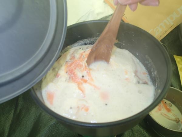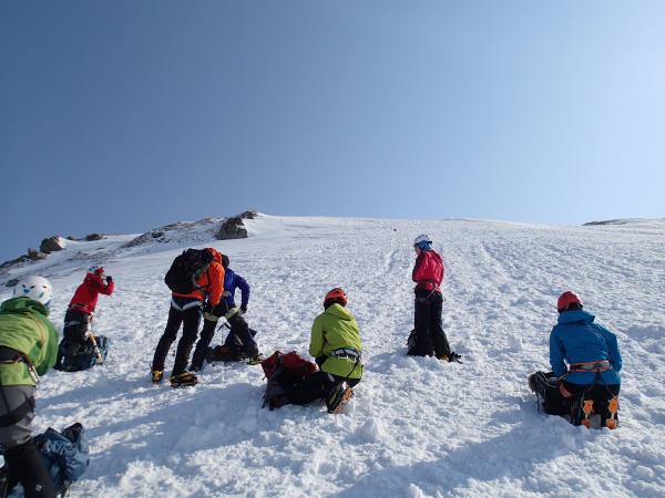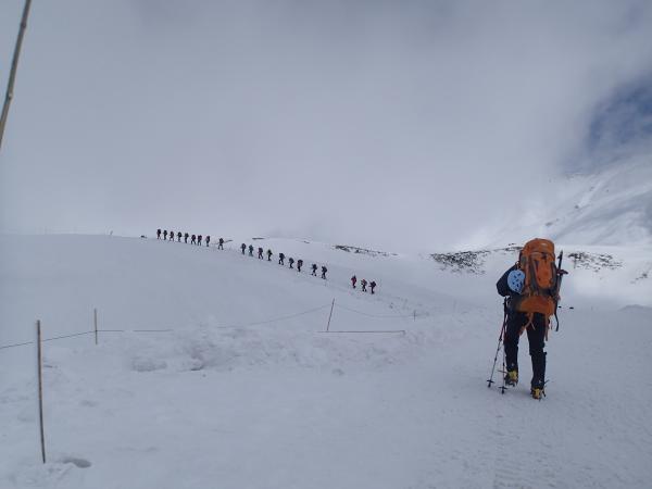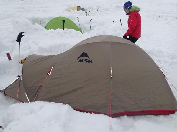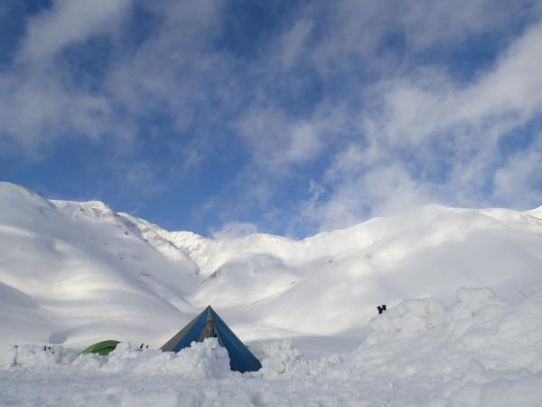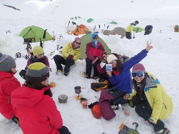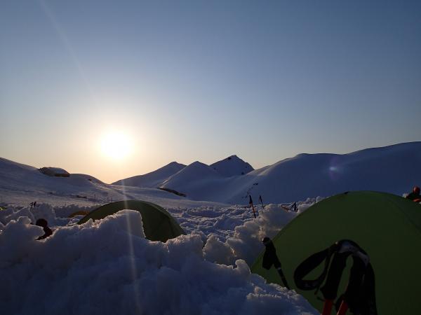初めての雪上テント泊。初日は5月の立山にしては冷え込み、なかなか眠れない人もいたようです。寒いときこそしっかりした装備で臨むことが大切だと感じました。