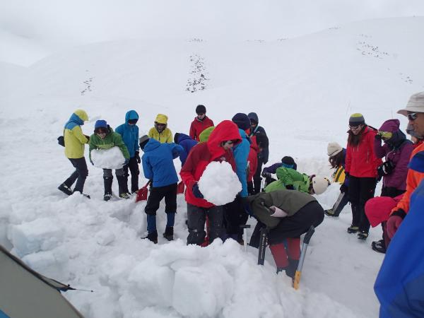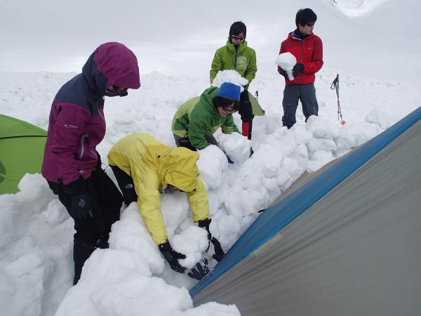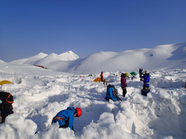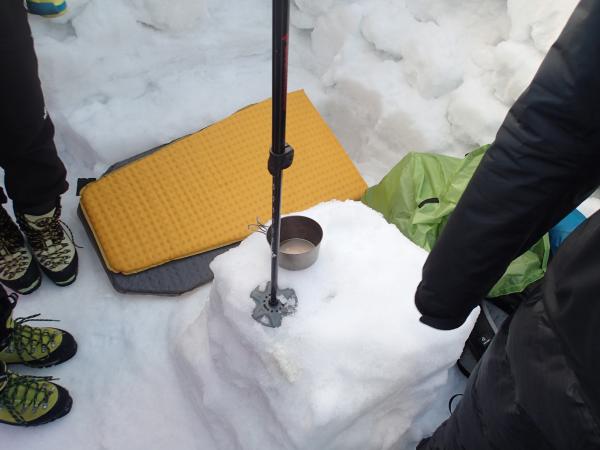 1日目は道具の基礎知識や、雪上でのテントのたて方等を実際に行いながら研修していただきました。ペグダウンの方法も学び、ブロック作りも体験しました。