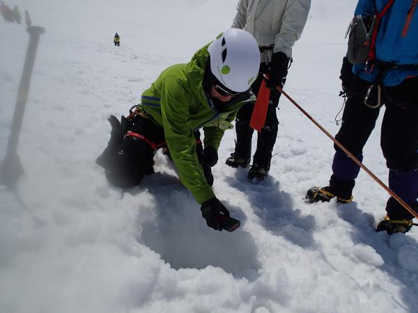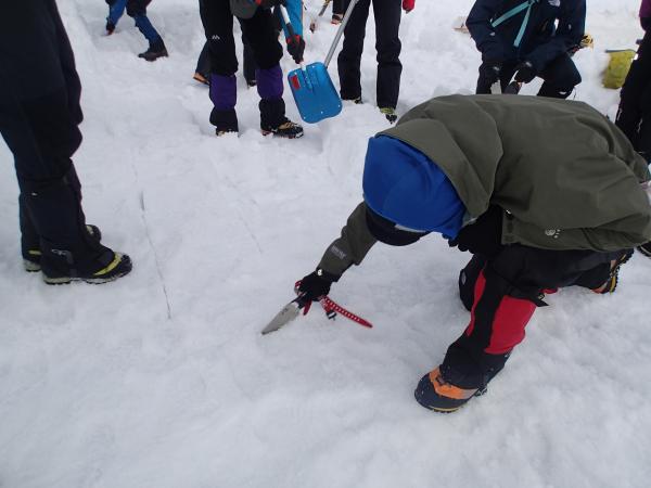 実際にビーコンでの捜索、プローブでの位置確認、ショベルでの掘り起こしの作業をすることで、捜索の手順を確認しながら覚えることができました。