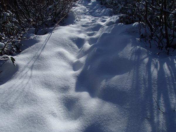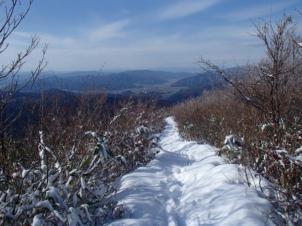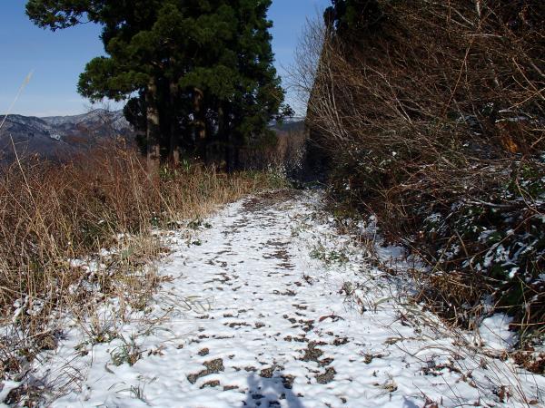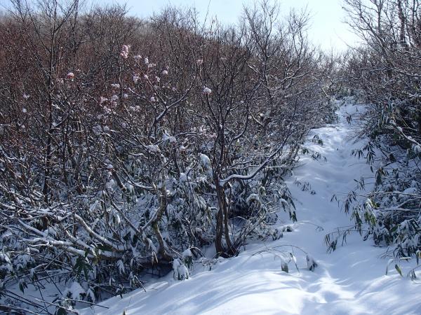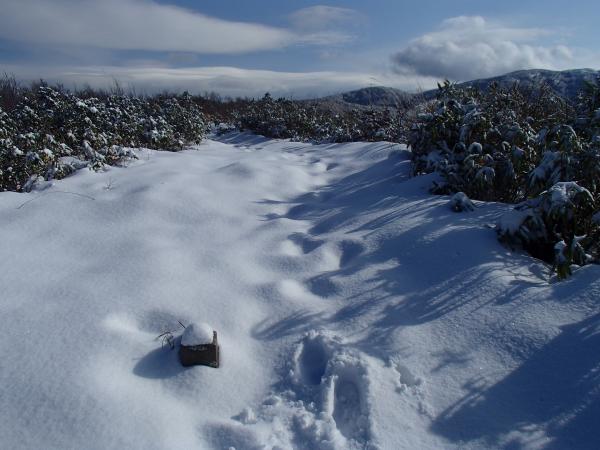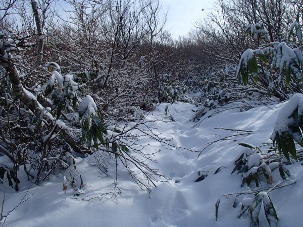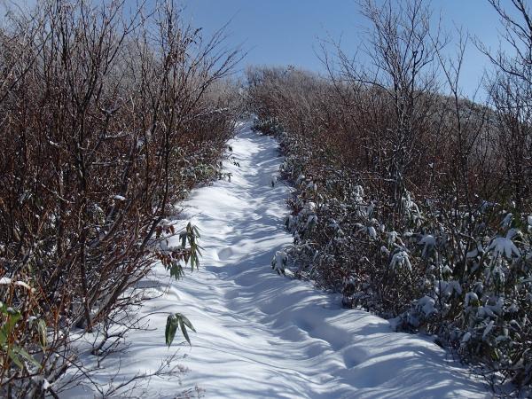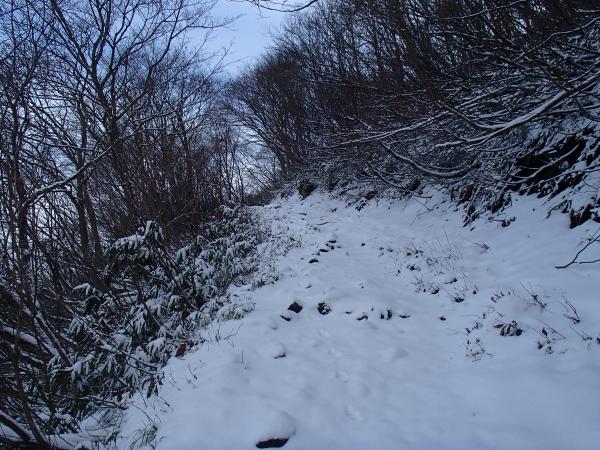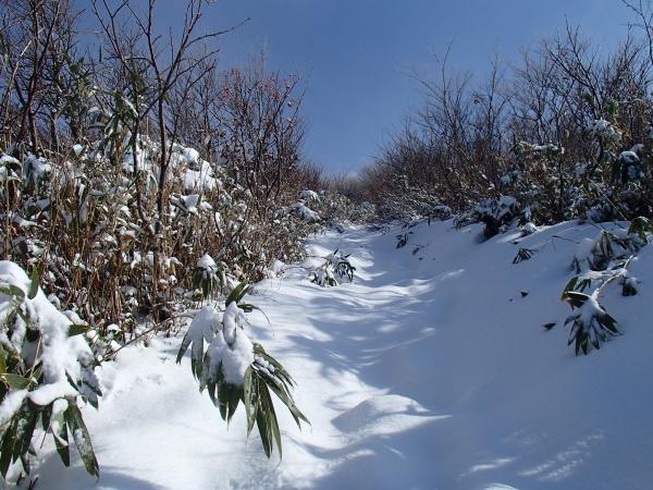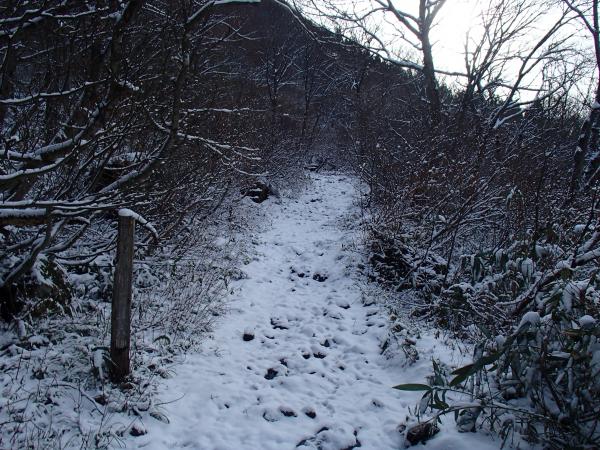 登山道全体に降雪、2,3㎝程度の深さ、山頂付近で足首程度。ルートは夏道どおり