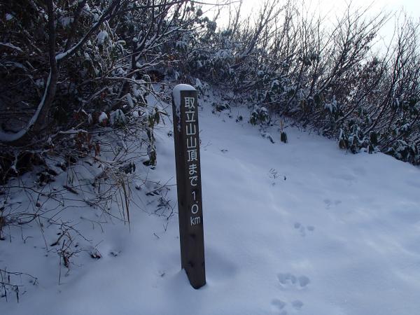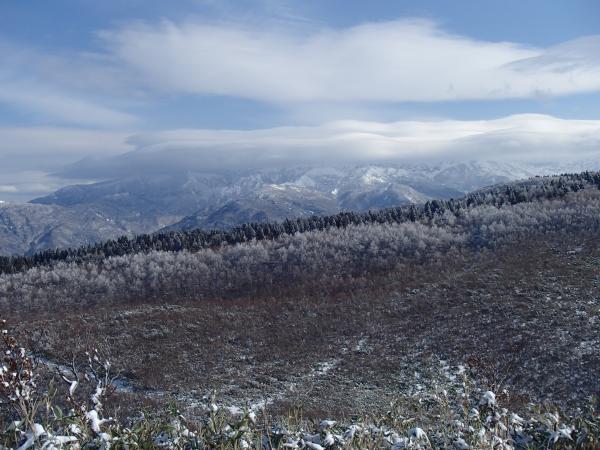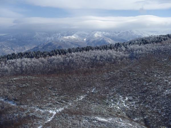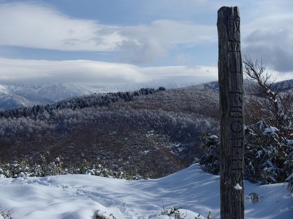 昨晩の雨はこの標高ではやはり雪だったようで、登山口に併設した駐車場手前の林道から降雪がありました。登山道には2,3㎝程度の雪があり、先行者はいなかったため新雪を楽しむことが出来ました。1100m付近から雪は足首程度の深さになりましたが、2日ほど前に福井県の山岳救助隊の訓練が大々的にあったのでトレースが頂上まであり、その上に雪がのった状態だったので登山靴のみで歩けました。本格的な雪山シーズン前の好条件が重なった一日でした。楽しみにしていた頂上からの白山は残念ながら雲に覆われて、雪を纏った全貌を見ることは出来ませんでした。