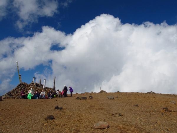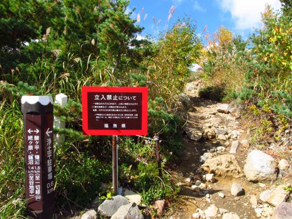 浄土平から一切経へショートカットの道は、火山ガスのため通行禁止。まずは鎌沼方面へ。秋の気配をそこここに感じながら、ゆっくり高度を稼ぎます。落ち着いたところが、鎌沼と一切経の分岐。避難小屋を通過して一切経山頂へ登っていきます。吾妻小富士を眼下に、途中からは草木の生えていない斜面を登って山頂到着。