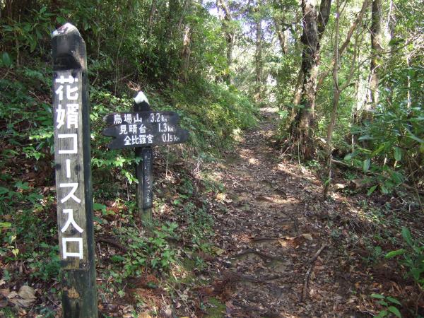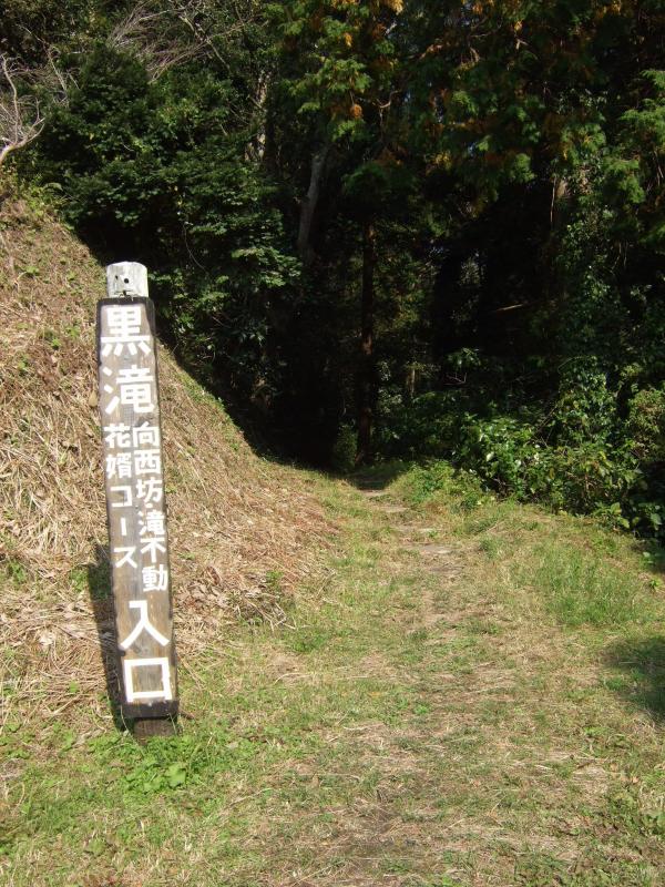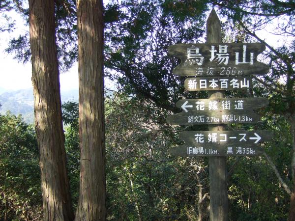 - 登山口(30分)花園広場(3分)黒滝(60分)烏場山山頂(30分)経文石(30分)花嫁街道入口
