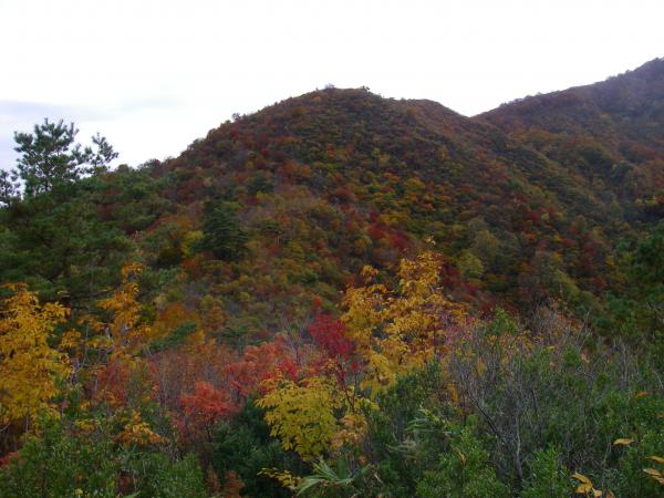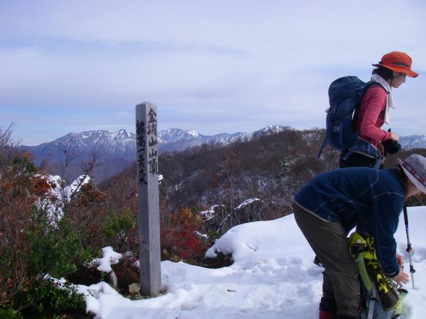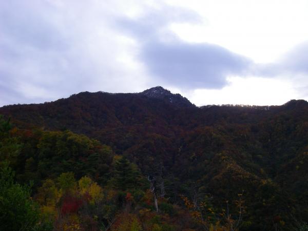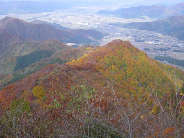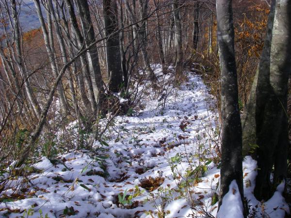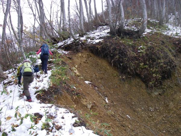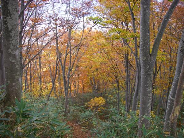 紅葉も少し期待して登ったが、ほぼ無し。新潟の紅葉は本当に一瞬だ。このルートは春はこぶしの花が咲くので有名なルートらしいが、登山者はほとんど居ない。天候も悪く、頂上もあきらかに雪の気配が・・・。気温が高かったので、アイゼンを使うほどではなかった。