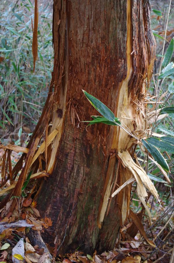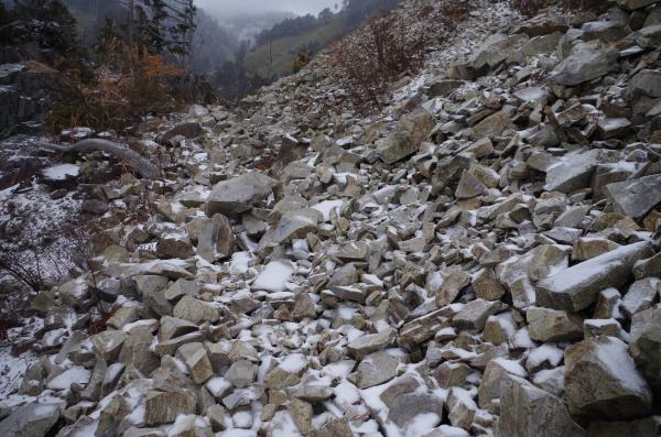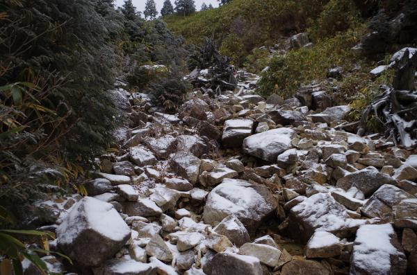 - 下と上の林道歩きが約12Km、登山口から細い登山道です、上の林道奥は崖崩れで、岩がゴロゴロの状態です、落石に注意!! 積雪は5Cm、気温ー5度