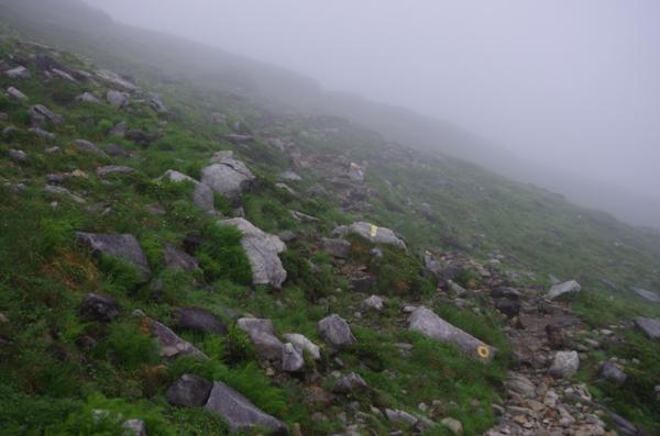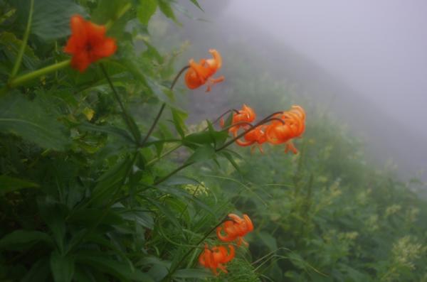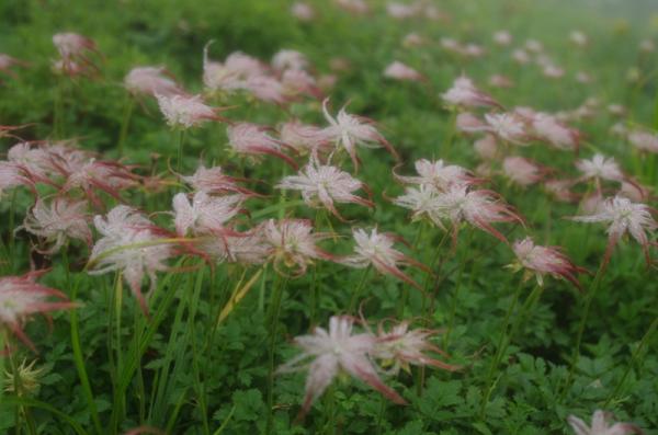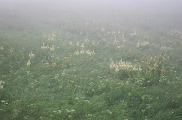 2日目の午前中は濃い霧で眺望が全くありませんでしたが、幻想的なお花畑を楽しみながら登りました。