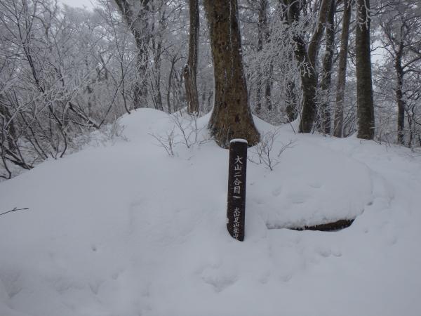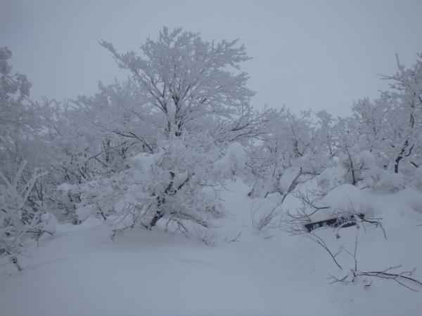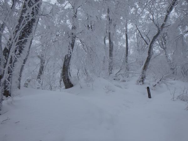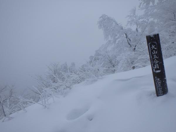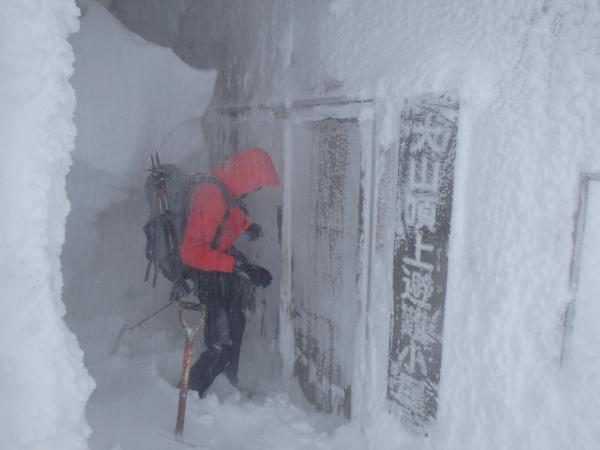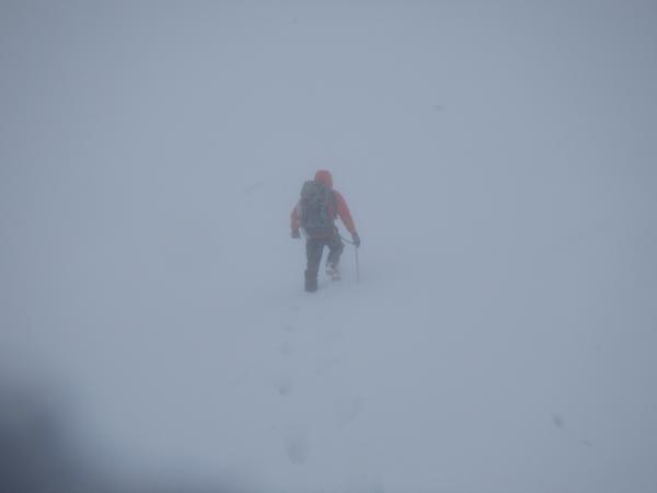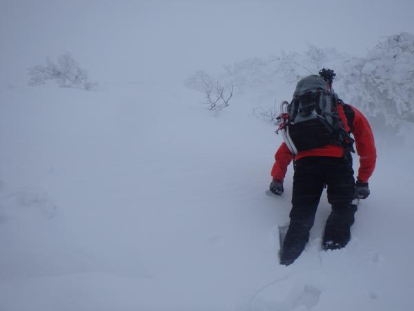 6合目避難小屋より上は小屋横の登り出しから7合目付近までは膝ぐらいまでのラッセルで8合目付近より上はガスにより視界は30mほどで強風。