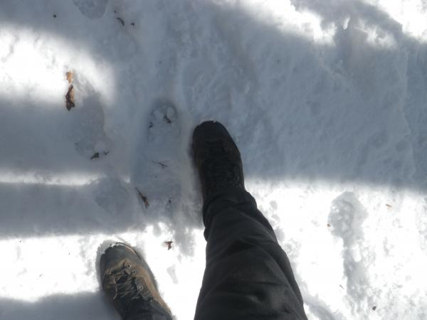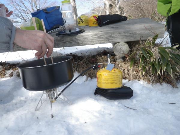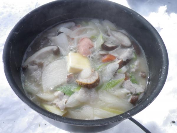 駐車場からすでに積雪があり思わぬ今シーズン初の雪山となりました。幸いこの日は風もなく快適な天候でした。当初からお昼は味噌バター鍋とメニューが決めてあったので、夏なら一面草地の広場で鍋してきました。