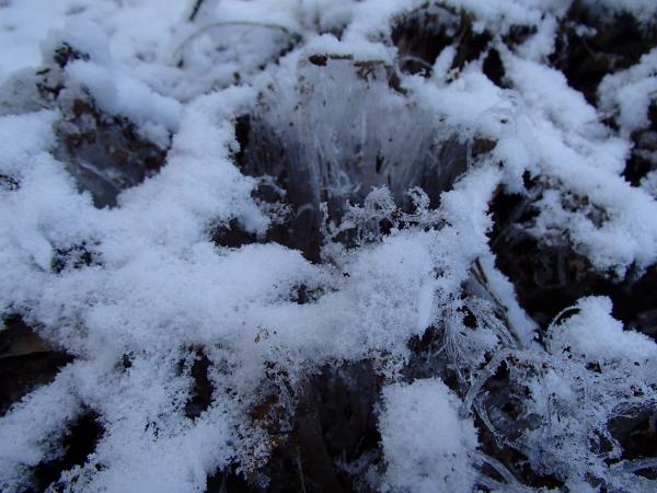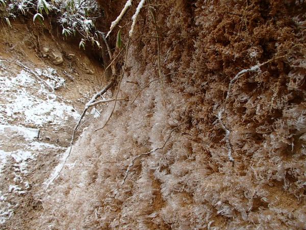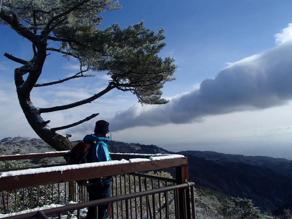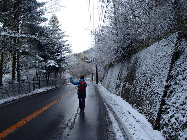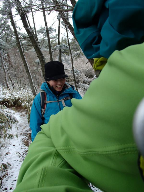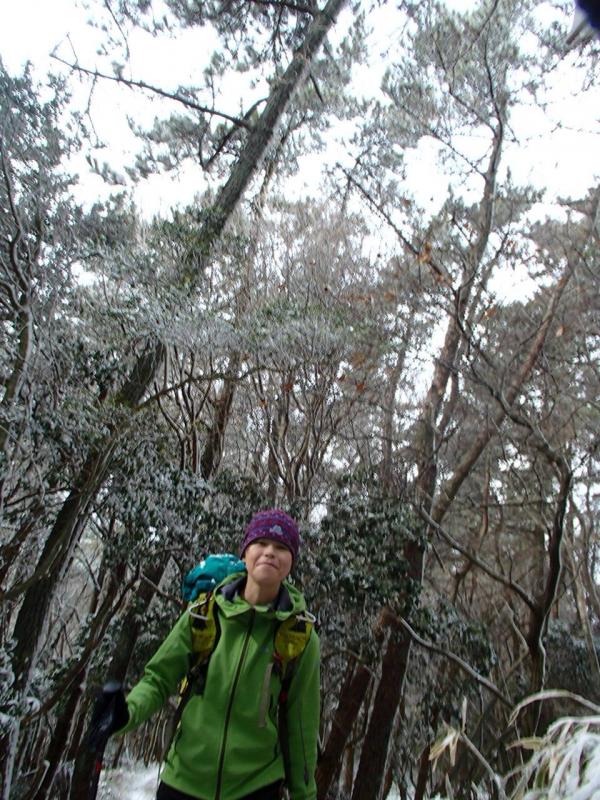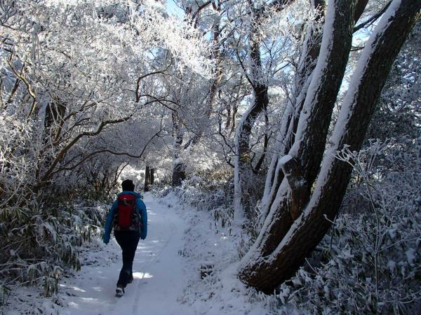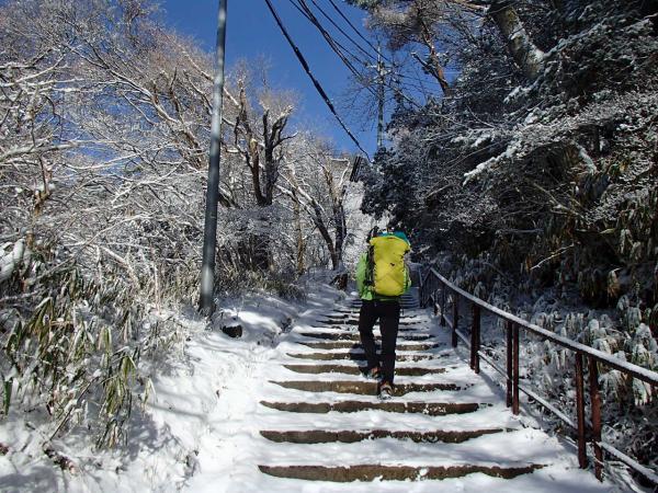 落ち葉や岩に積もった雪は滑りやすく、登山道も一部凍結している箇所もある所があるので軽アイゼンの携行をおすすめします。