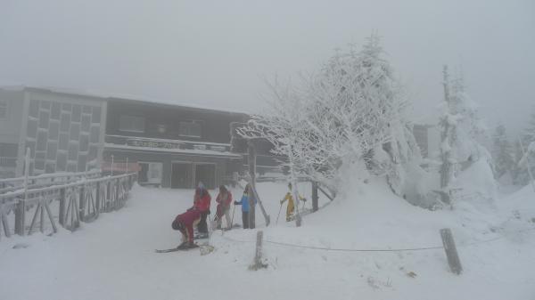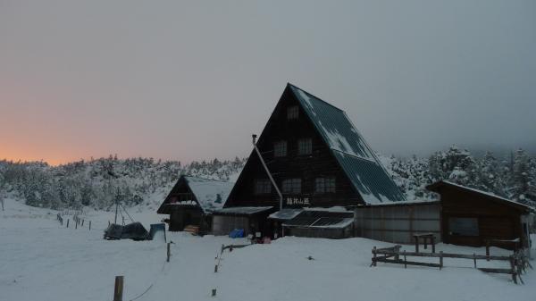 悪天候で小屋の前も真っ白。念願の山での初日の出は見れませんでした。